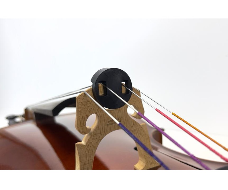 The Tourte mute is a popular mute which is widely used. The mute stays on the instrument when not in use and then easily slipped on to the bridge when required. When engaged, the mute sits across the G and D strings, muting the bridge. The rubber of the mute is secure to use on your Cello and will not damage the instrument or the strings in any way.